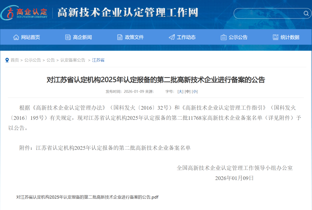 近日,根据《高新技术企业认定管理办法》及相关规定,全国高新技术企业认定管理工作领导小组办公室对江苏省认定机构2025年认定报备的第二批企业进行备案公示。米兰电竞凭借其扎实的科技创新实力与完善的研发管理体系,成功荣列在本次备案中。